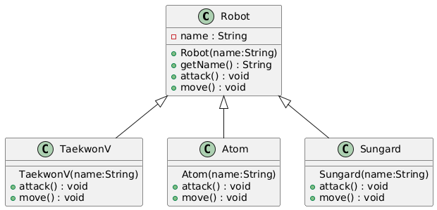 Robot taekwonV = new TaekwonV("TaekwonV"); // 태권 브이 객체 생성